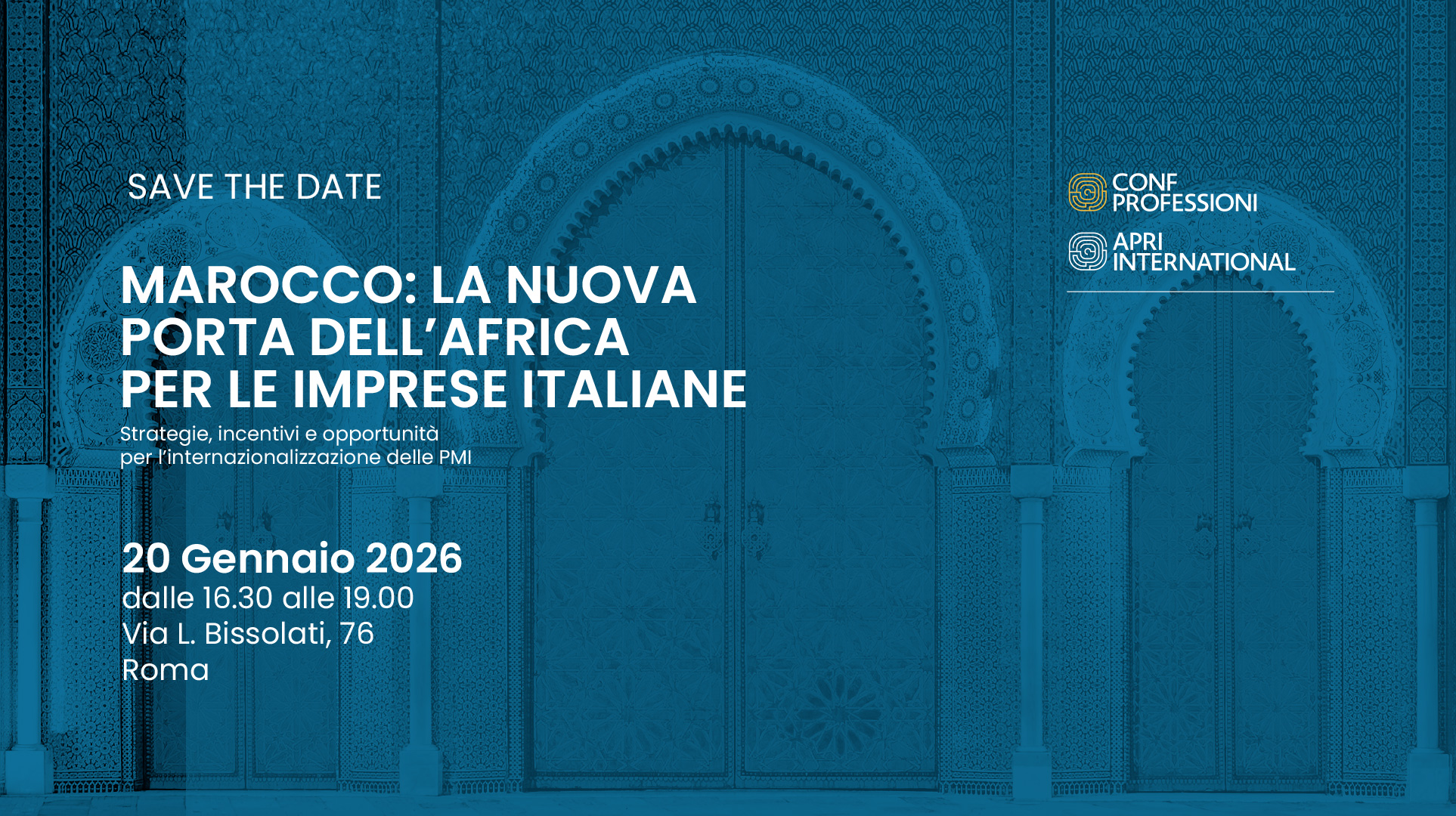 MAROCCO: LA NUOVA PORTA DELL’AFRICA PER LE IMPRESE ITALIANE Strategie, incentivi e opportunità per l’internazionalizzazione delle PMI 📅 20 Gennaio 2026🕓 Ore 16:30 – 19:00📍 Via L. Bissolati, 76 – [...]