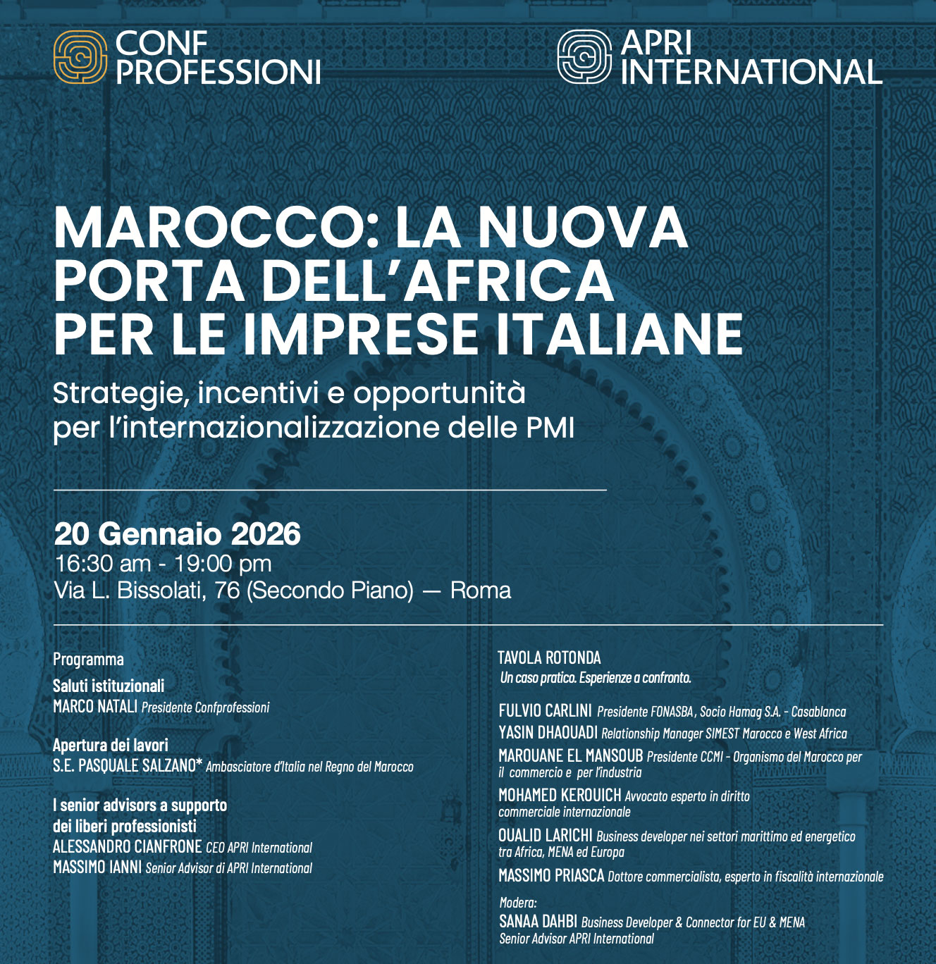 L’incontro, promosso da Confprofessioni e APRI International, è rivolto a professionisti, imprenditori e PMI italiane interessate ad ampliare il proprio raggio d’azione nei mercati emergenti.